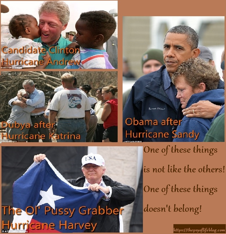 I love the way he boasts about the size of the storm and flood as if it is like his words or brains or people he surrounds himself with. You know he has the BEST words, the BEST brain, the BEST people, and, now, the BEST storm! Because it is only the BEST for the Ol’ Pussy Grabber! Just like he congratulated that poor soldier for earning a purple heart. Just like he bragged about the size of the crowd that turned out to see HIM!