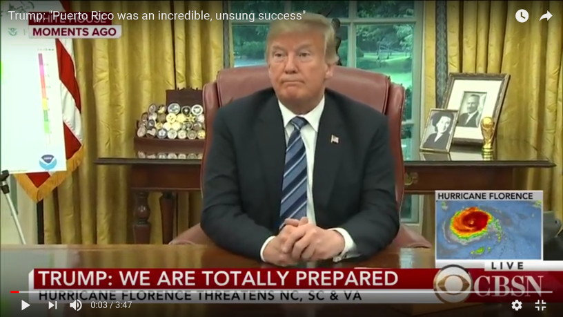 It’s started by a reporter asking what lessons he learned from Puerto Rico (the jokes on him, the Ol’ Pussy Grabber, like all personality disorders can’t learn! Ha ha! Such fun!) and how is he going to apply those lessons to Hurricane Florence making landfall now?