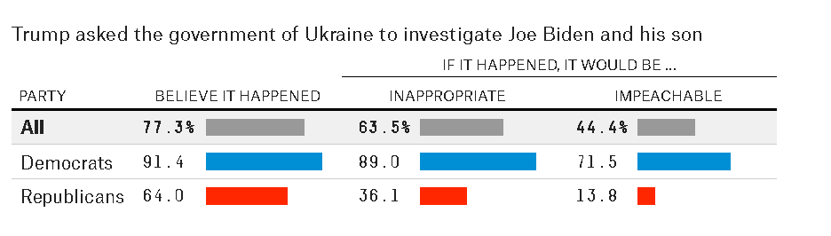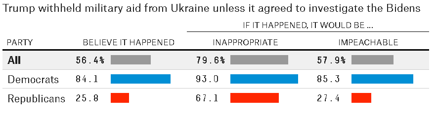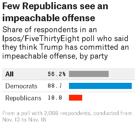 There is a huge partisan divide on impeachment both in the Congress and among the American public. FiveThirtyEight reports some interesting and somewhat alarming polling statistics in Most Americans Think Trump [sic] Committed an Impeachable Offense. Have a gander and think about this one: