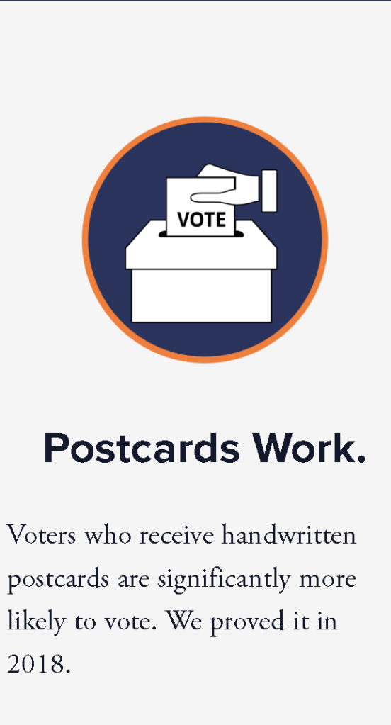 They go on to tell us that postcards work! To date 25,673 volunteers have sent 2,015,750 postcards to ten swing states! You could be the 25,674th volunteer! Imagine that!