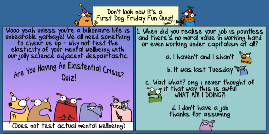 Remember kids: Answer A, B, C or D to test your mental wellbeing. Sign up here to get an email (it takes you to The Guardian, just in case you don’t want to go there) whenever First Dog cartoons are published. Get all your needs met at the First Dog shop if what you need is First Dog merchandise and prints, which you do!