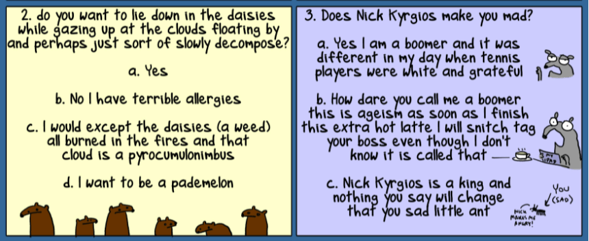 - Question three reads, Does Nick Kyrgios make you mad? Apparently Nick Kyrgios is a professional Australian tennis player who was ranked as high as 60th in the world as of June 2021. He played at Wimbeldon this year where he lost; otherwise, we’d know a lot more about him. Maybe it is his being mixed race that might lead to this question?