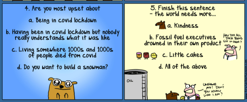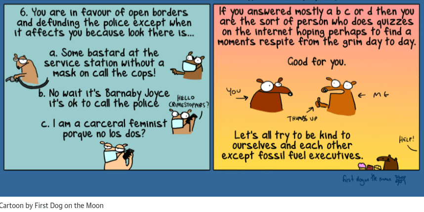 - The last panel reads, in part, Let’s all try and be kind to each other fossil fuel executives. This is a type of Australian joke and is not in anyway shape or form advocating for the physical, mental, or emotional harm to be committed against real live human beings — yes fossil fuel executives are real live human beings — no matter how despicable they are and how longlasting devasting harm they cause the planet and all living beings on it in pursuit of their own shortsighted self-serving entitled goals. Apparently disparagement humor is still a thing there.