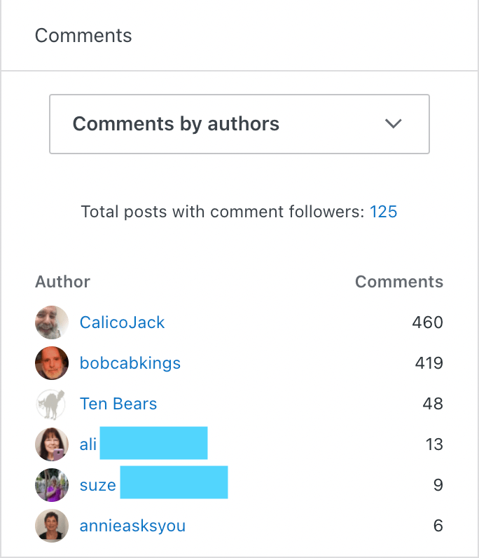 COMMENTERS: The people who leave comments are extra special to me. The dialogue that they engage in is the icing on the cake. Let’s just go through a few of the numbers and personalities involved:
