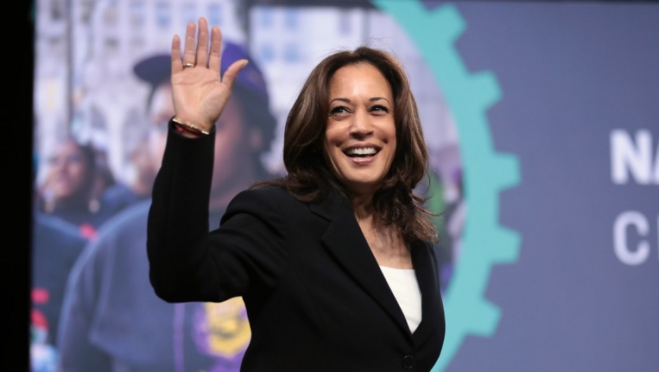 An image showing Kamala Harris walking across a stage in front of a projected image of a Black person inside of a gear-like circular green frame on a dark blue background. There are the capital letters, N and C on the right side of the image. Harris is smiling and looking at her audience with her right hand raised, fingers extended, and palm out as if waving.
