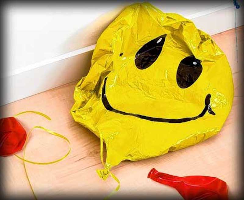 A picture of a yellow smiley face balloon that has deflated and is lying on the floor against the baseboard of a wall. There are two uninflated red balloons near it.